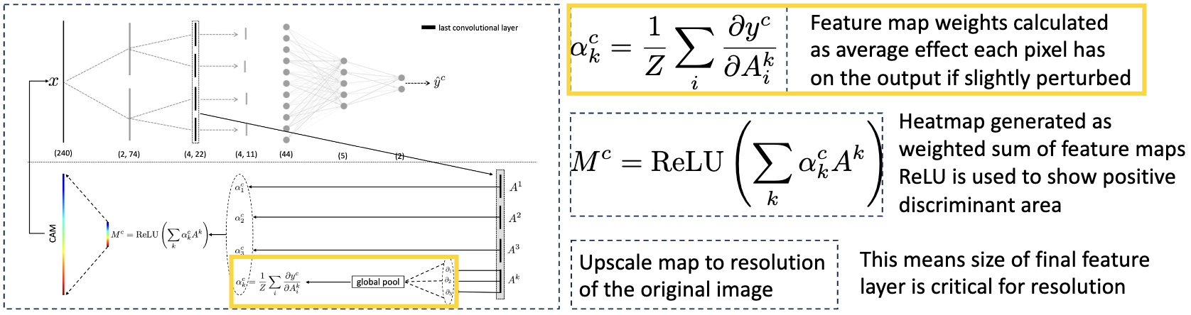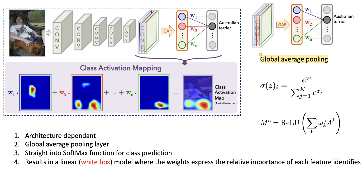 Frees up architecture constraints; Don’t have to compromise accuracy as final conv layer can go into any function, not just a SoftMax; Final feature map resolution dictates the graduality of the explanation; Tension between high level semantics and explanatory resolution; Cannot compare the intensity of final heatmaps between different instances; Still requires CNN.