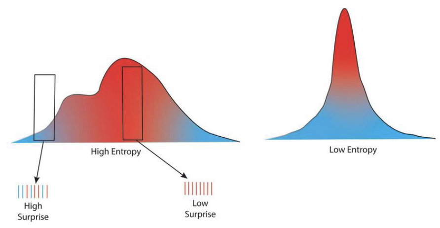 Right plot — Low entropy: The distribution is sharply peaked; most mass sits near the center, so average unpredictability is low. Tail events would still be surprising, but they’re rare and contribute little to the average.