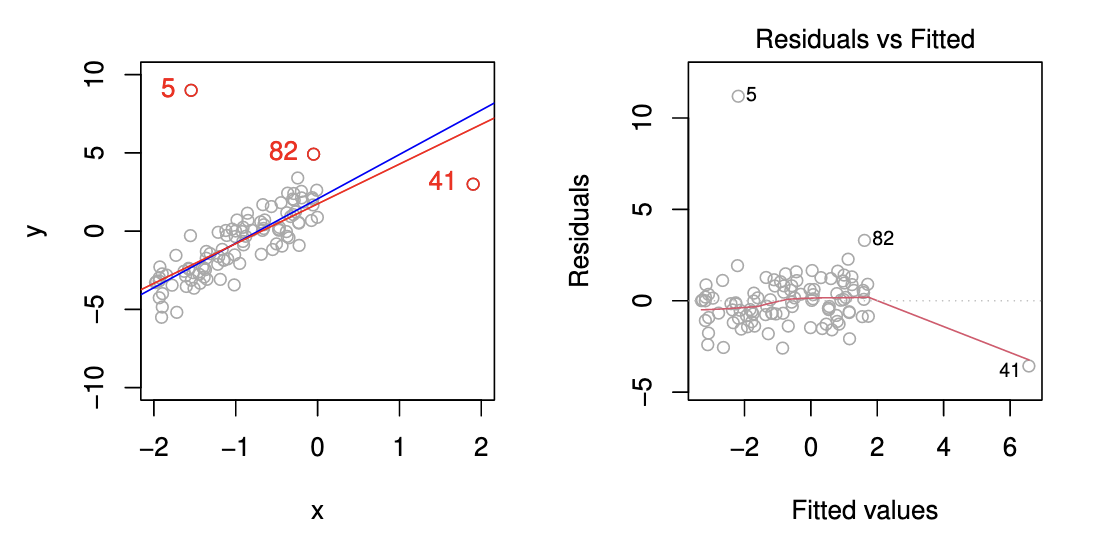 We just saw that outliers are observations for which the response is unusual given the predictor . In contrast, observations with high leverage have an unusual value for . For example, observation 41 in the Figure below has high leverage, in that the predictor value for this observation is large relative to the other observations. Contrary to observation 41, observation 5 has an unusually large -value relative to . Observation 5 however is an outlier and does not have a high leverage since the predictor value is near to the other predictor values.